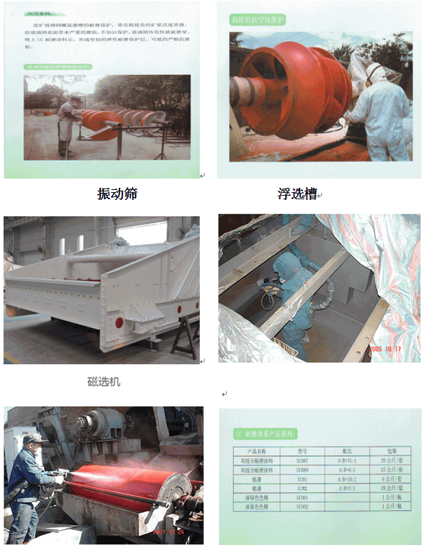 SPUA材料可用于解決各種環(huán)境下的耐磨、防腐問題,典型的應(yīng)用如礦砂廠和選煤廠用的流槽、滾筒、螺旋集合器、浮選槽、振動(dòng)進(jìn)料盤、旋轉(zhuǎn)式圓筒篩架、振動(dòng)磨、球磨機(jī)、選礦機(jī)、旋風(fēng)分離器以及礦山的泥漿輸送設(shè)備。