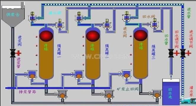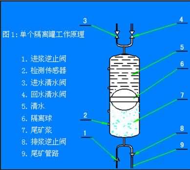 水隔離漿體泵是由高位礦漿池(濃縮池或喂料泵)向隔離罐中浮球下部喂礦漿,再用清水泵向浮球上部供高壓清水,再通過浮球將壓力傳遞給礦漿,并把礦漿推到外管線輸送到指定地點。由微機控制的液壓站驅動六臺清水閥,使三個隔離罐交替排漿、喂漿,實現均勻穩定輸送。通過傳感器反饋的信號,微機對系統進行實時監控,并由故障診斷專家系統對故障進行分析、判斷,再通過可視化系統提示給操作者。該產品的總體思路與原理具有創新性。它利用高效率、長壽命的離心式清水泵作動力源采用巧妙的隔離裝置——浮球,把工作介質(清水)與被傳輸介質(礦漿)隔離開。隔離裝置即將清水動力傳遞給漿體,還將離心泵的旋轉運動方式轉變成了容積泵的往復運動方式。使本產品兼具離心泵流量大,往復泵揚程高的雙重特點。