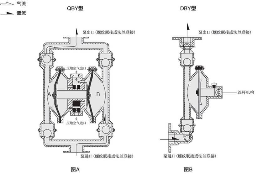 ? 2、在泵的兩個(gè)對(duì)稱工作腔中,各裝有一塊有彈性的隔膜,聯(lián)桿將兩塊隔膜結(jié)成一體,壓縮空氣從泵的進(jìn)氣接頭進(jìn)入配氣閥后,推動(dòng)兩個(gè)工作腔內(nèi)的隔膜,驅(qū)使聯(lián)桿聯(lián)接的兩塊隔膜同步運(yùn)動(dòng)。與此同時(shí),另一工作腔中的氣體則從隔膜的背后排出泵外。一旦到達(dá)行程終點(diǎn)。配氣機(jī)構(gòu)則自動(dòng)地將壓縮空氣引入另一個(gè)工作腔,推動(dòng)隔膜朝相反方向運(yùn)動(dòng),這樣就形成了兩個(gè)隔膜的同步往復(fù)運(yùn)動(dòng)。每個(gè)工作腔中設(shè)置有兩個(gè)單向球閥,隔膜的往復(fù)運(yùn)動(dòng),造成工作腔內(nèi)容積的改變,迫使兩個(gè)單向球閥交替地開啟和關(guān)閉,從而將液體連續(xù)地吸入和排出。