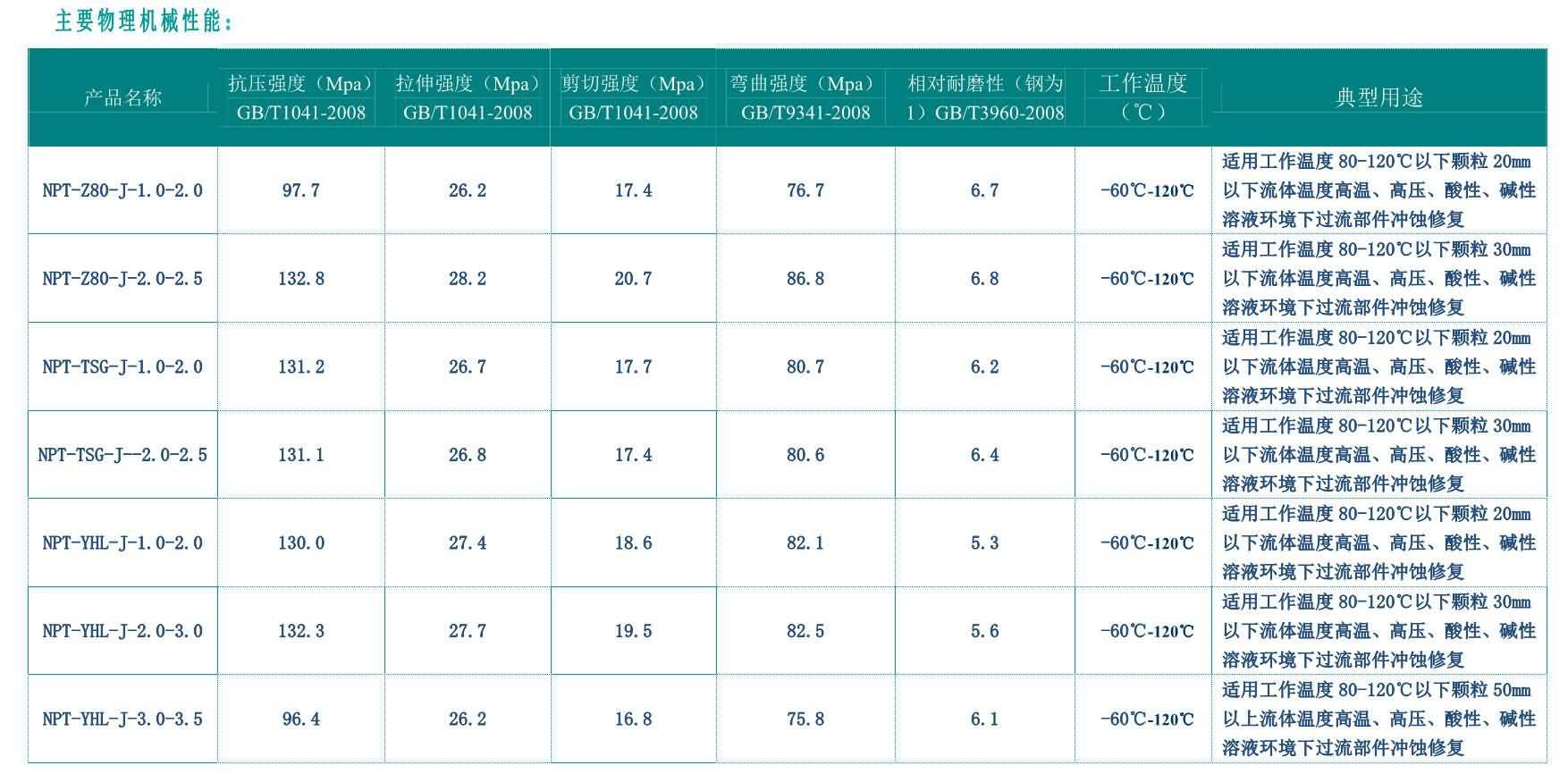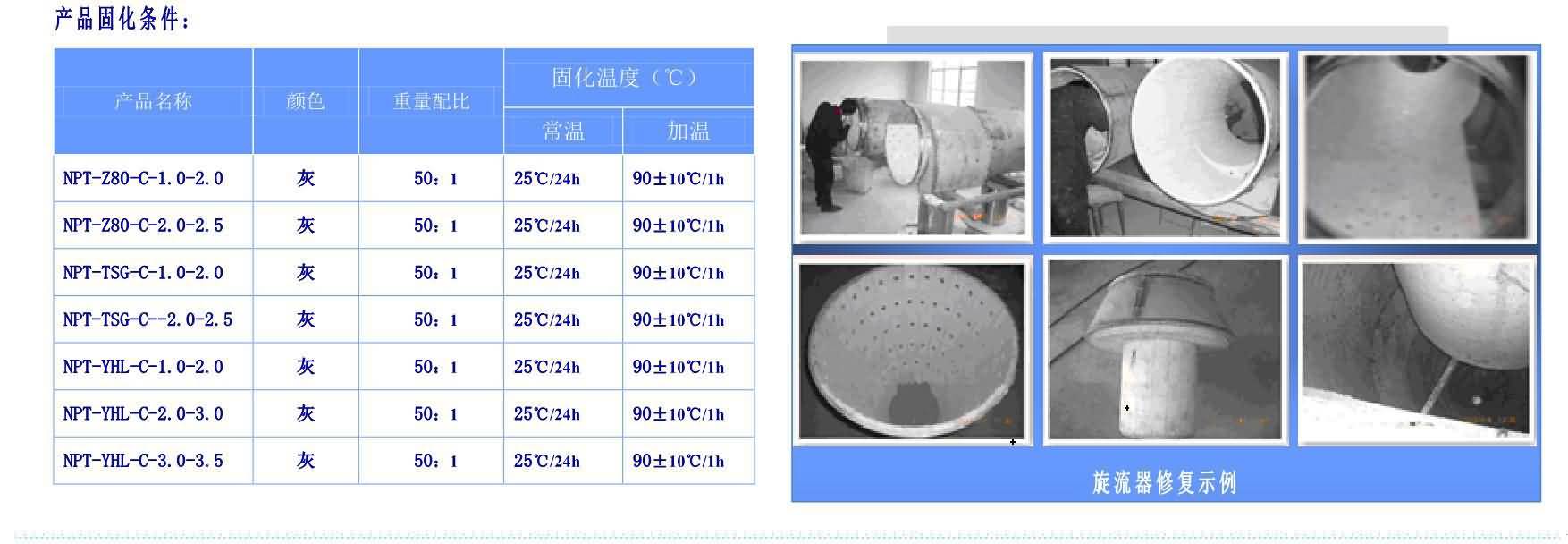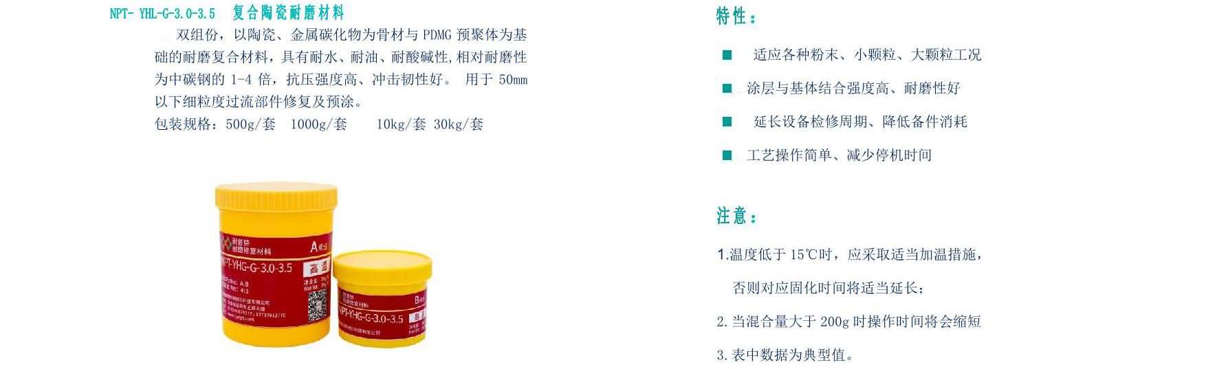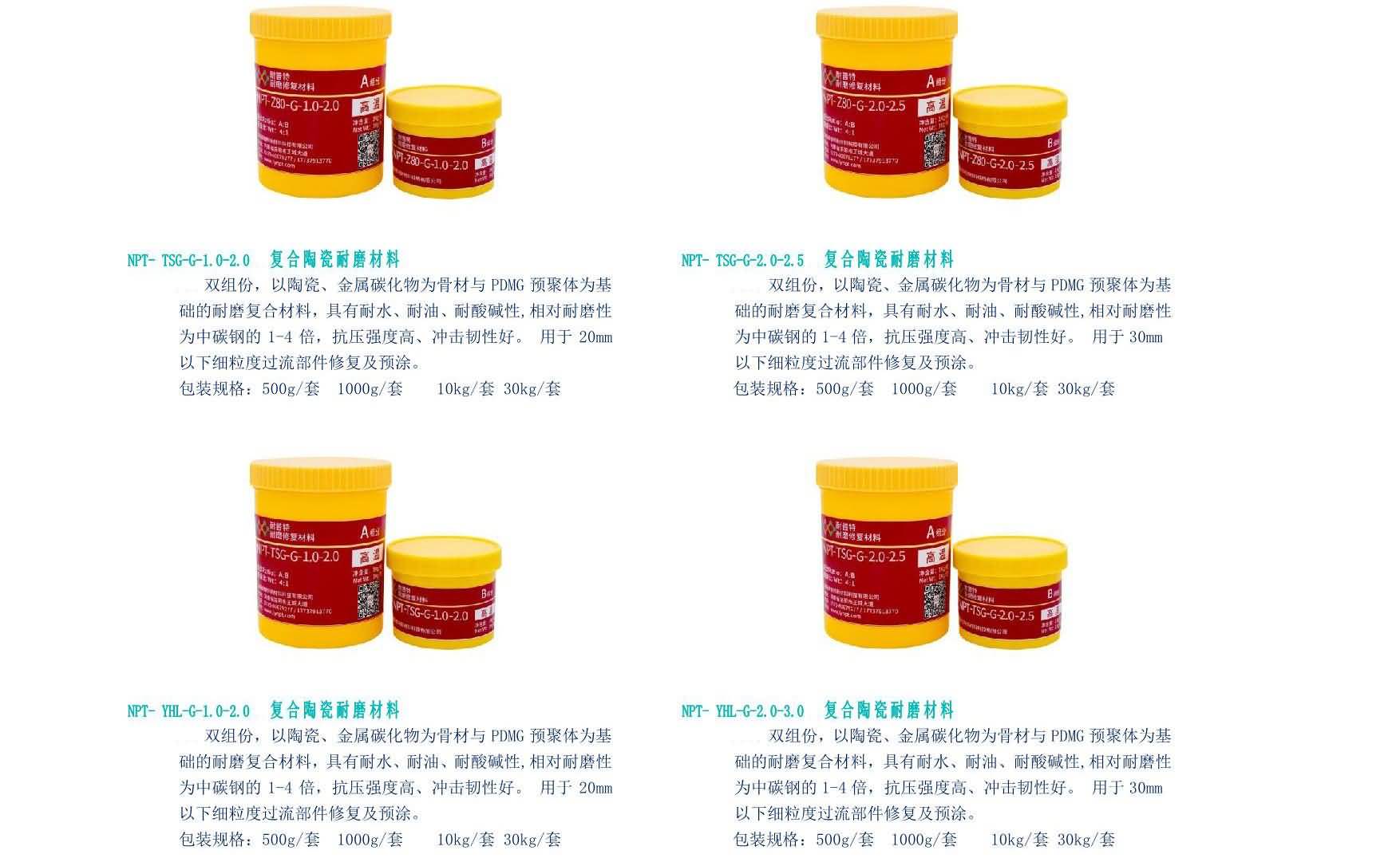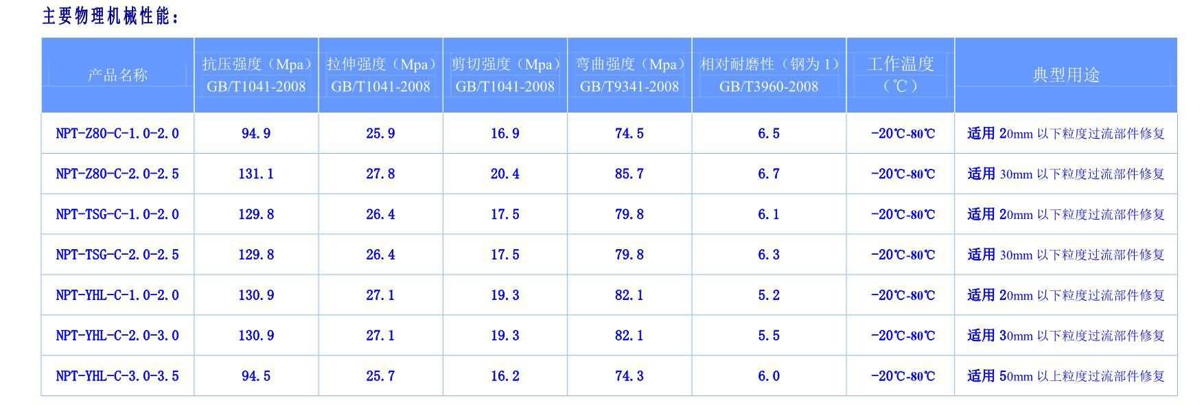 雙組分,以陶瓷、金屬碳化物、微型顆粒為骨材的耐磨復合材料,具有耐水、耐油、耐酸堿性。適用(-60℃-250℃)設備過流沖蝕、設備的大面積修復、設備預涂耐磨層,如旋流器、浮選柱、浮選機、泡沫槽、分級機、攪拌桶、溜槽、管件類、泵類等修復(典型用途見主要物理機械性能表)。