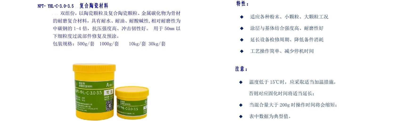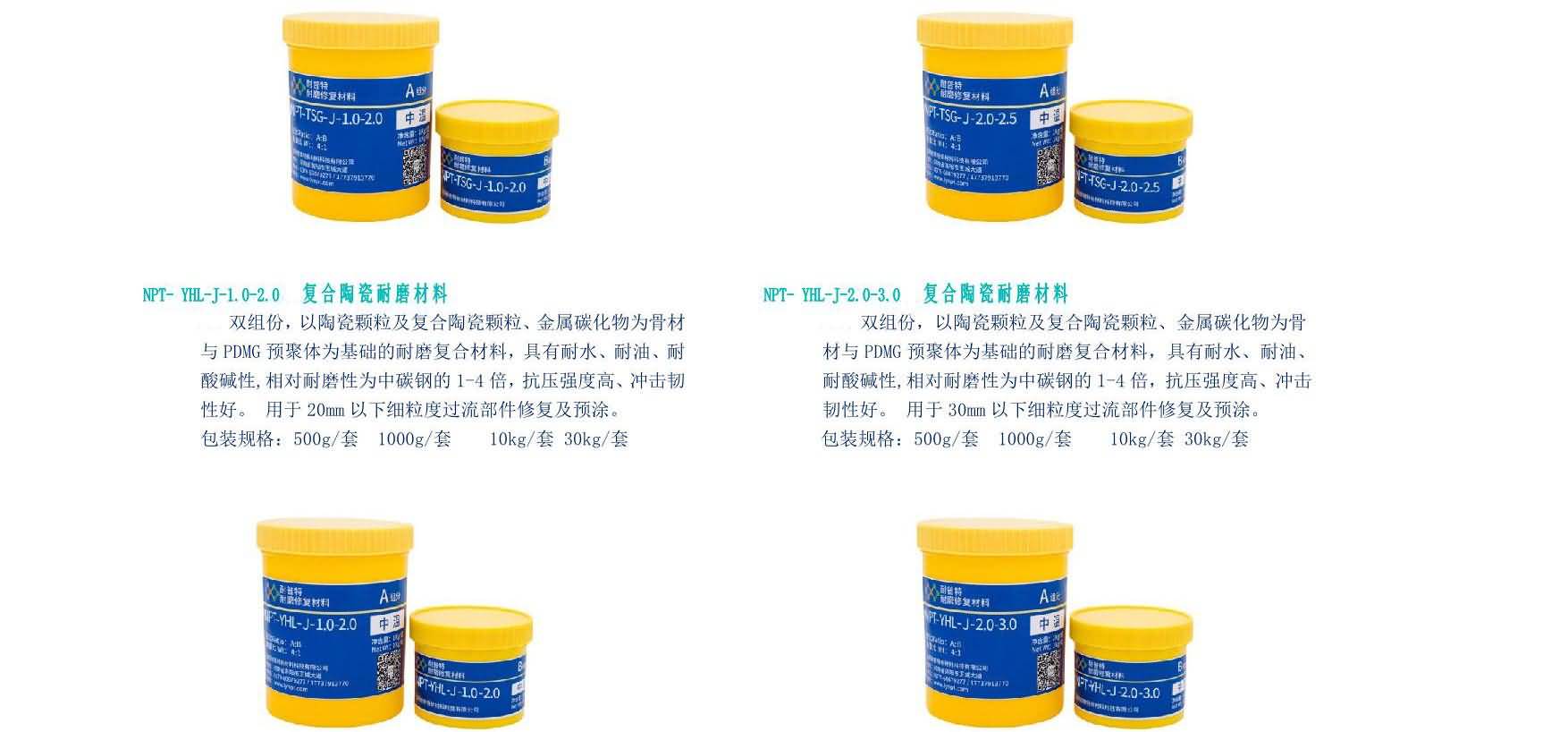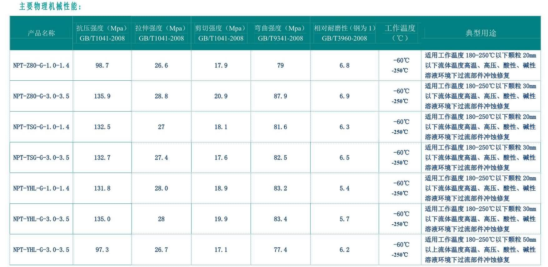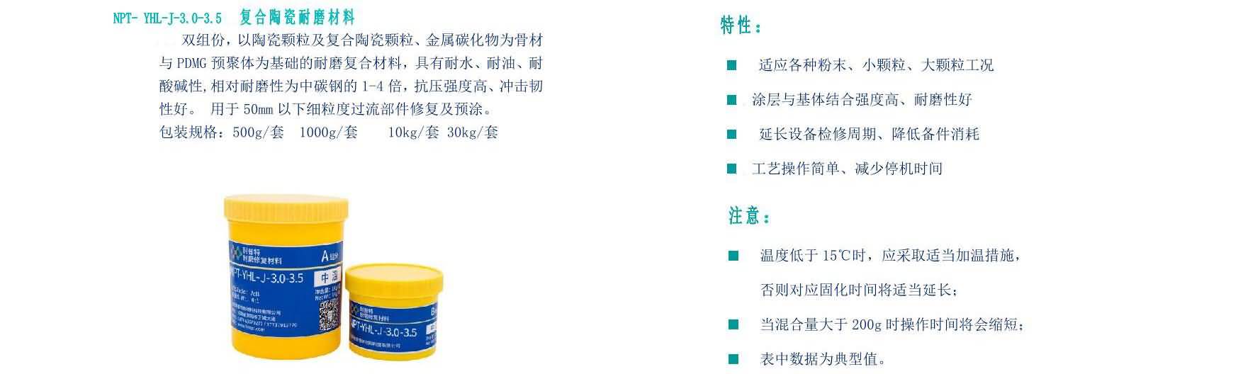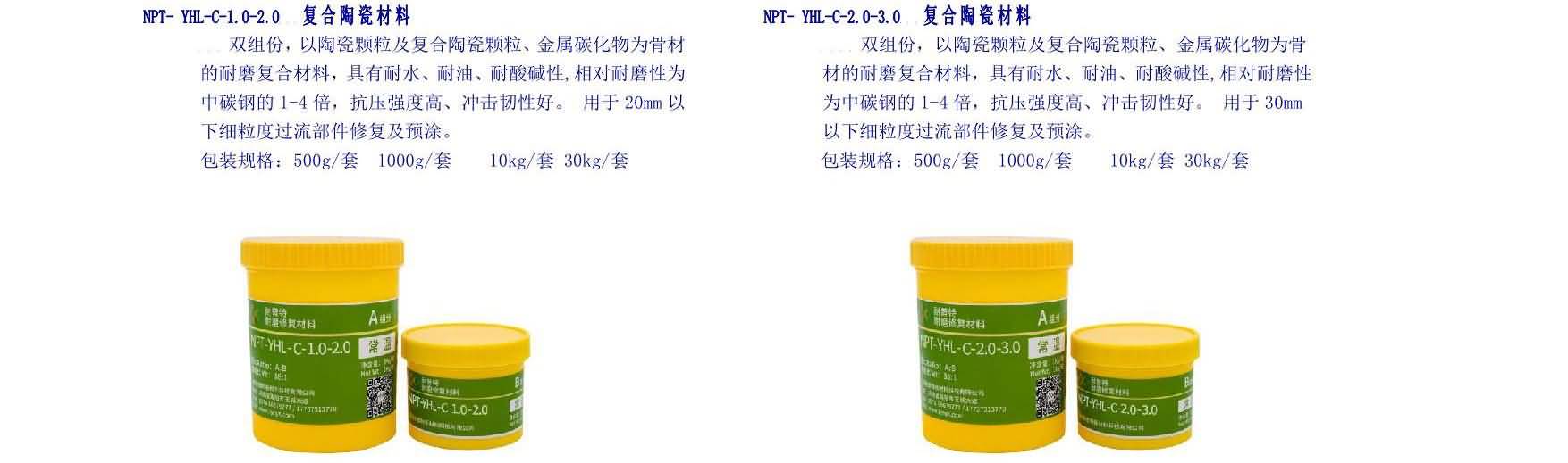 雙組分,以陶瓷、金屬碳化物、微型顆粒為骨材的耐磨復合材料,具有耐水、耐油、耐酸堿性。適用(-60℃-250℃)設備過流沖蝕、設備的大面積修復、設備預涂耐磨層,如旋流器、浮選柱、浮選機、泡沫槽、分級機、攪拌桶、溜槽、管件類、泵類等修復(典型用途見主要物理機械性能表)。