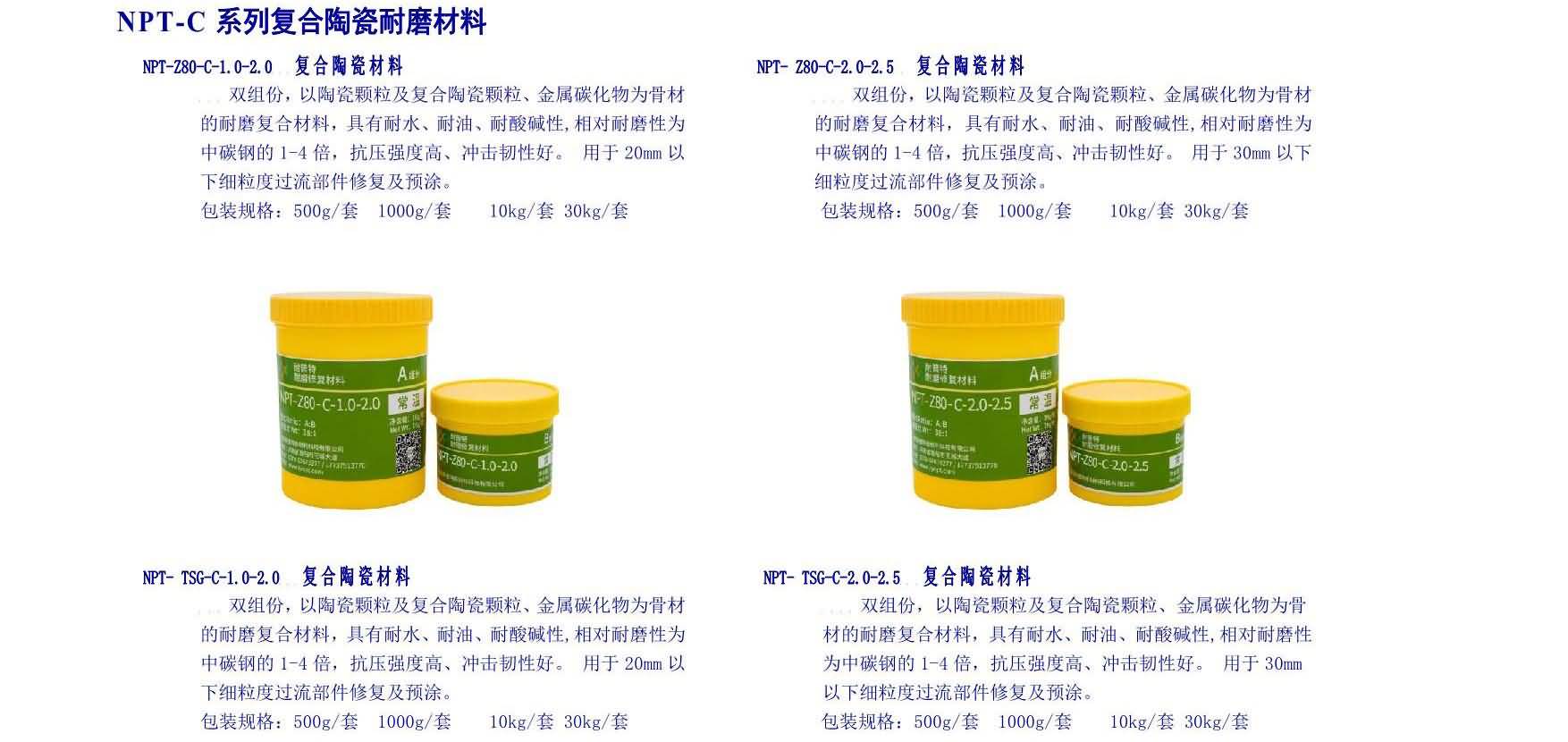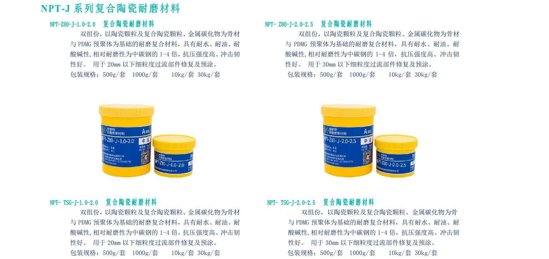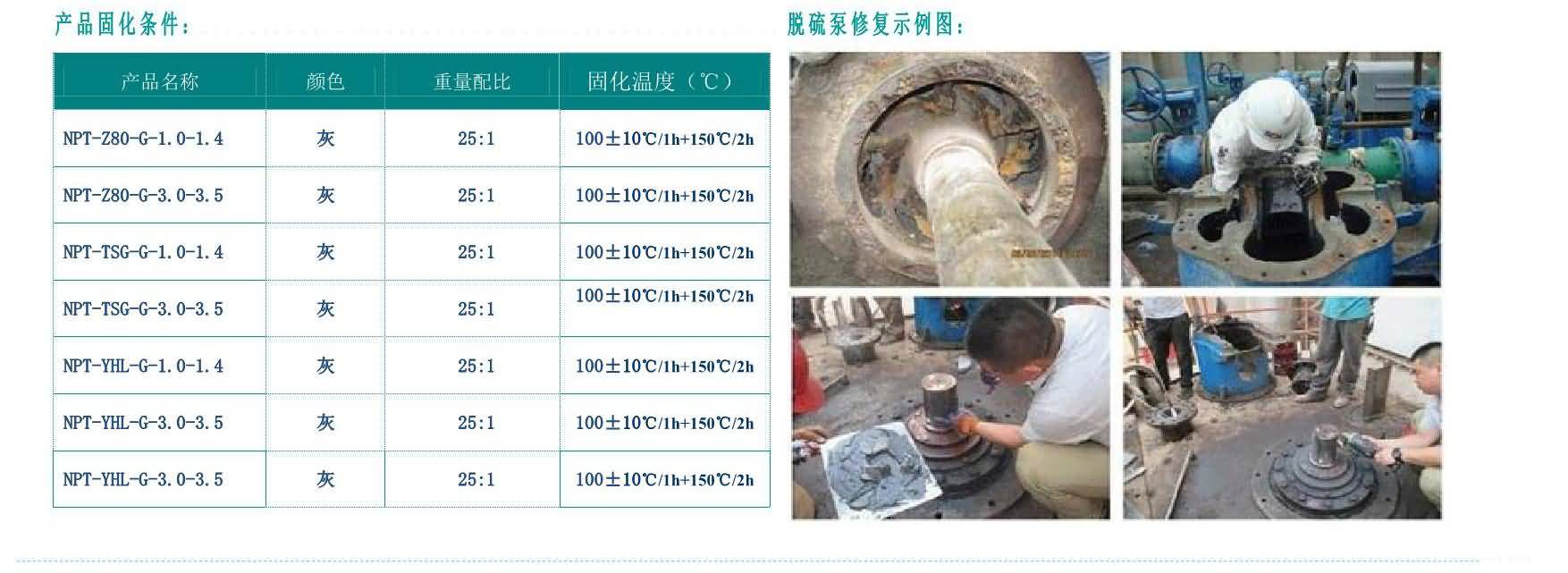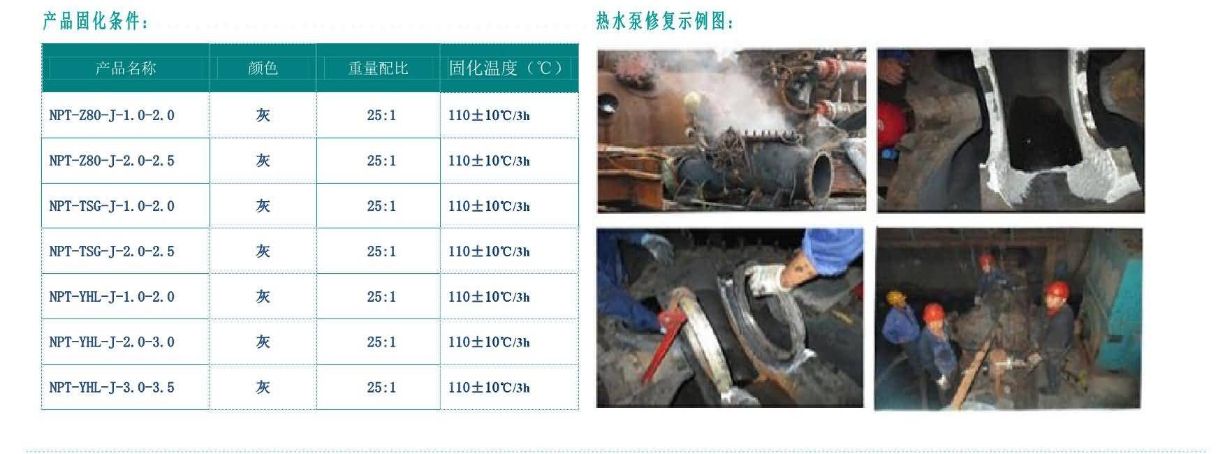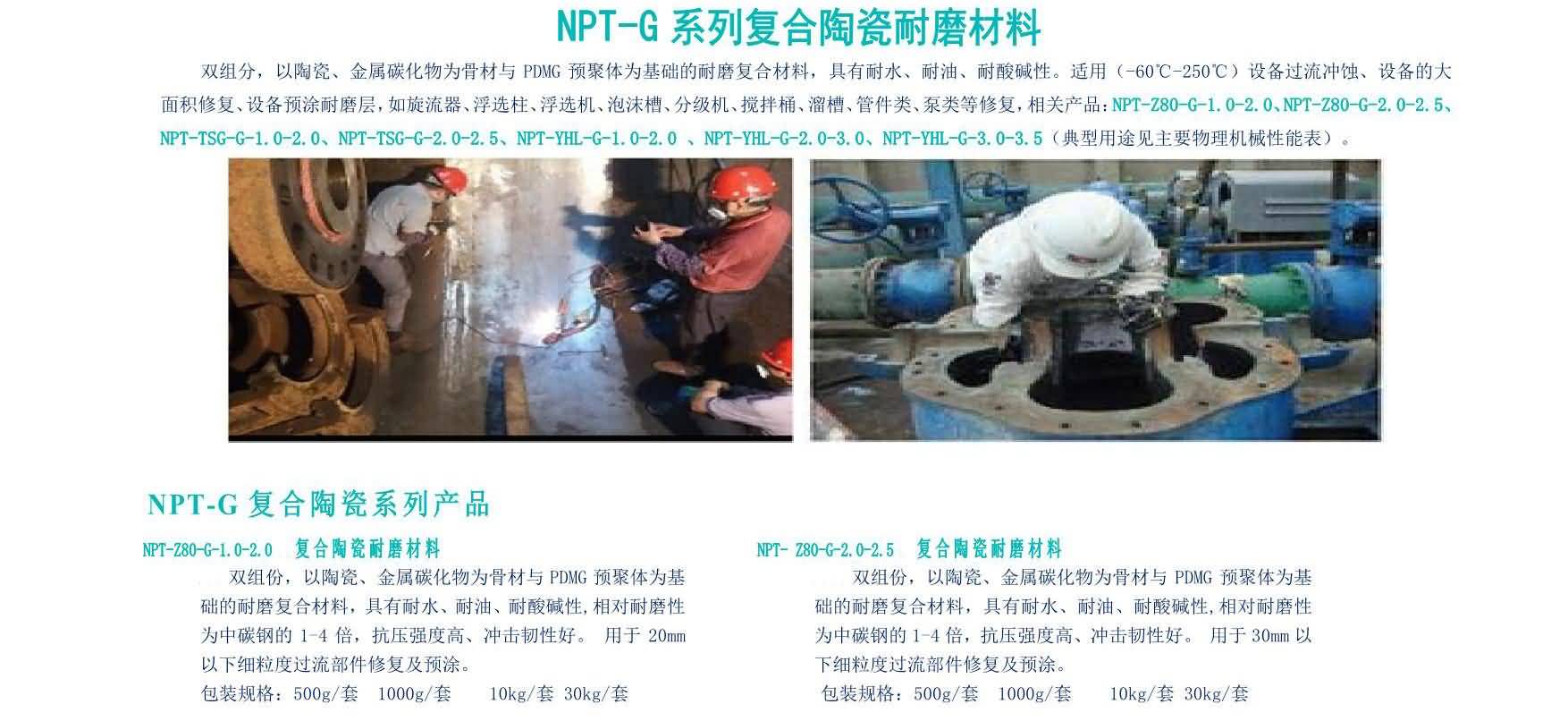 雙組分,以陶瓷、金屬碳化物、微型顆粒為骨材的耐磨復合材料,具有耐水、耐油、耐酸堿性。適用(-60℃-250℃)設備過流沖蝕、設備的大面積修復、設備預涂耐磨層,如旋流器、浮選柱、浮選機、泡沫槽、分級機、攪拌桶、溜槽、管件類、泵類等修復(典型用途見主要物理機械性能表)。